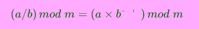 모듈러 연산에서는 (a / b) mod m을 직접 구할 수 없습니다. 대신 b의 모듈러 역원(Modular inverse)를 곱하는 방식으로 계산할 수 있습니다.