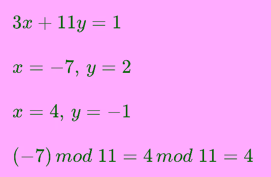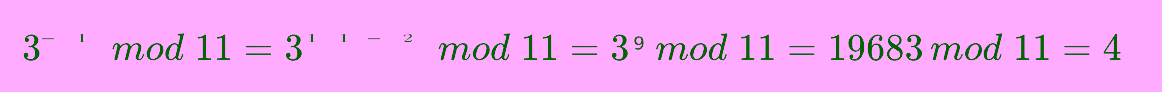 모듈러 역원(Modular inverse): 정수 a와 m에 대해 (a * x) mod m = 1을 만족하는 정수 x를 a의 모듈러 역원이라고 합니다. 예를 들어 정수 a가 3이고 m이 11일 때 (3 x 4) mod 11 = 1이므로 3의 모듈러 역원은 4입니다.