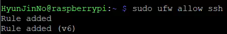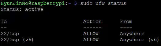 만약 라즈베리파이에 원격 접속을 하고 있을 때 방화벽을 활성화한다면 SSH 연결이 끊어질 수 있습니다. 먼저 다음과 같이 SSH 접근을 허용합니다. 기본적으로 SSH는 22번 포트에 TCP 통신을 사용하므로 일반적으로 22번 포트에 대한 접근이 허용될 것입니다.