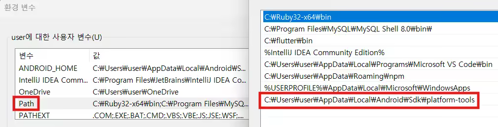 이후 사용자 변수 path의 편집 버튼을 누른 뒤 다음과 같이 platform-tools 경로를 추가합니다.