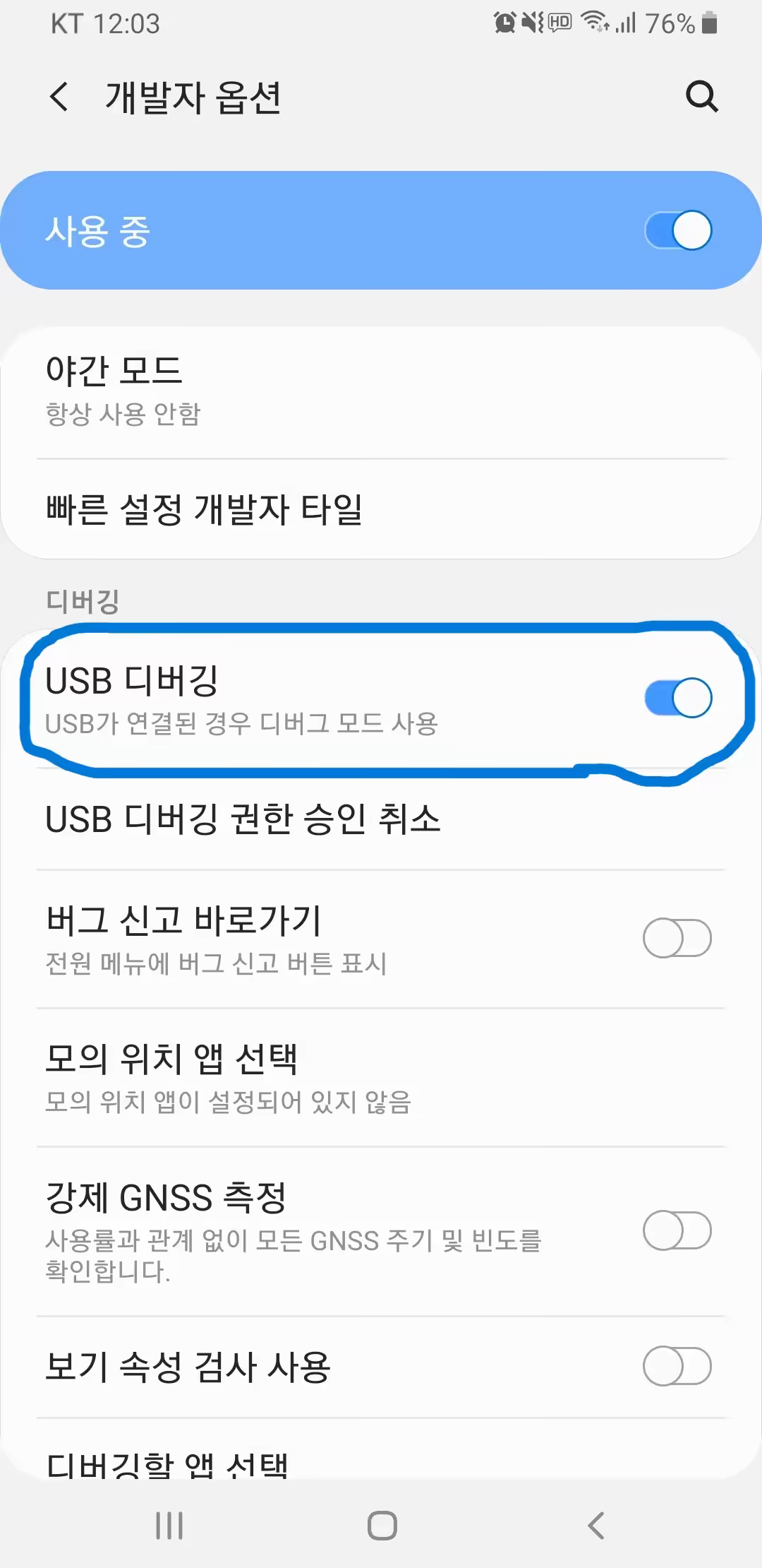 먼저 안드로이드 기기에서 설정 > 개발자 옵션으로 들어간 후 USB 디버깅을 활성화합니다.
