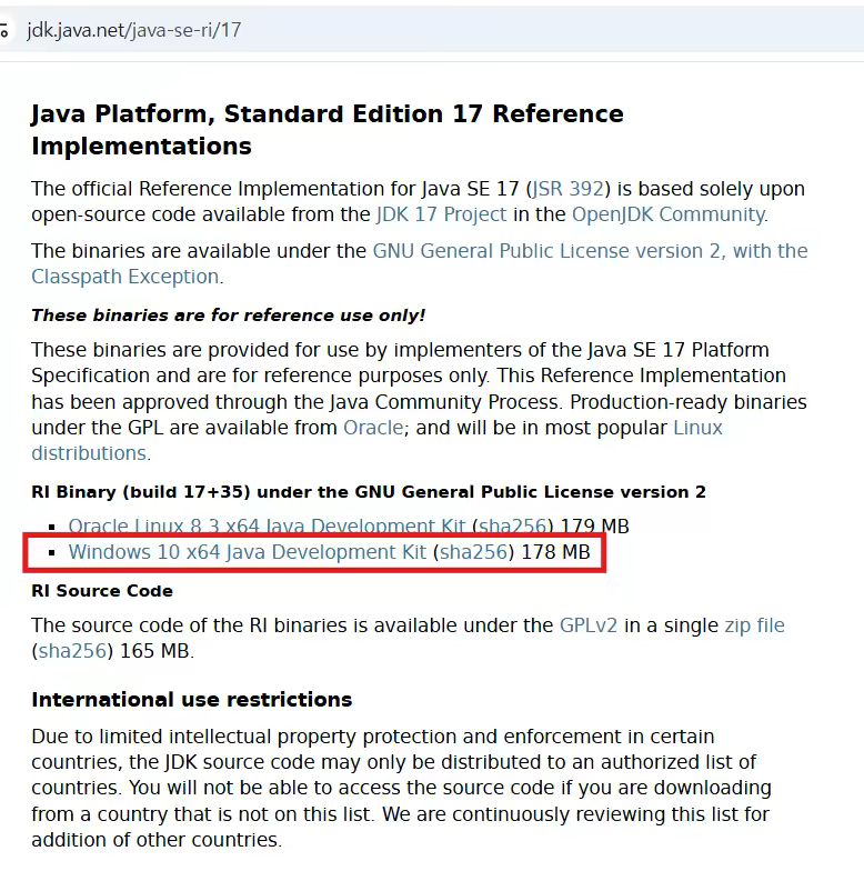 공식 문서에서 권장하는 대로 JDK 17을 설치하겠습니다. 다음 링크에 접속하여 openJDK 17 압축 파일을 다운로드합니다.