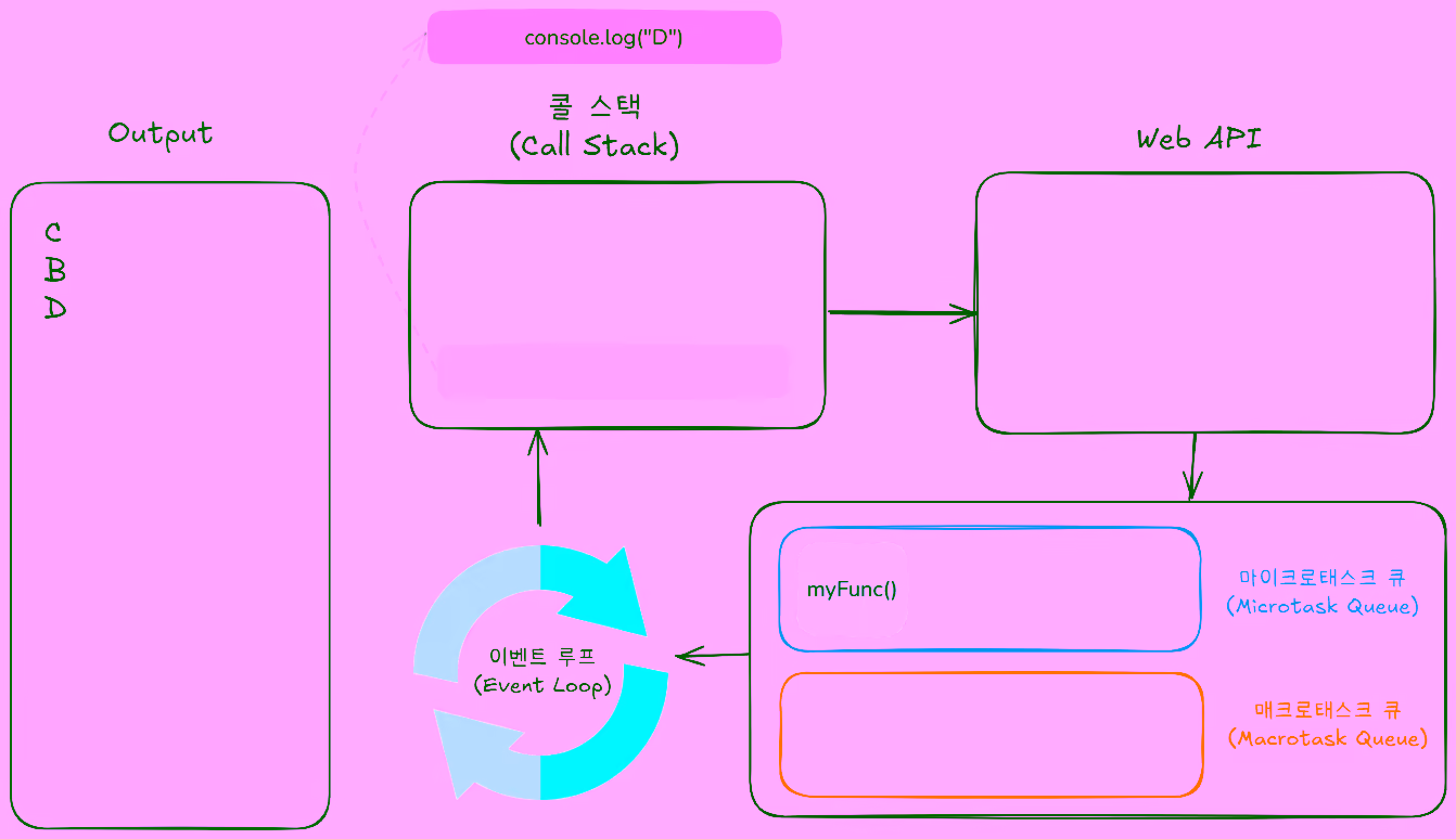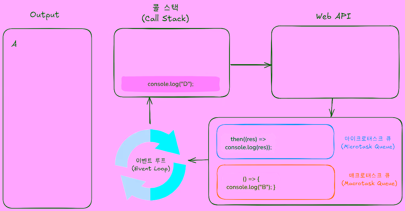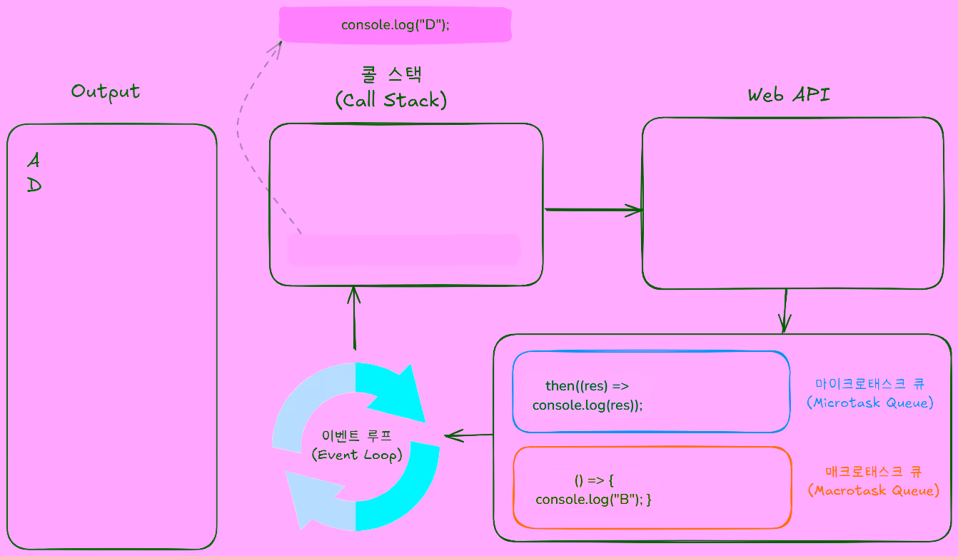 콜 스택에console.log("D");가 추가되어 실행된 후 콜 스택에서 제거됩니다.