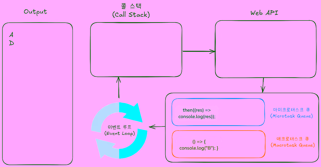 9console.log("D");출력 순서는 "A" → "D" → "C" → "B" 입니다.