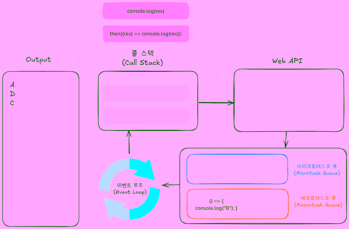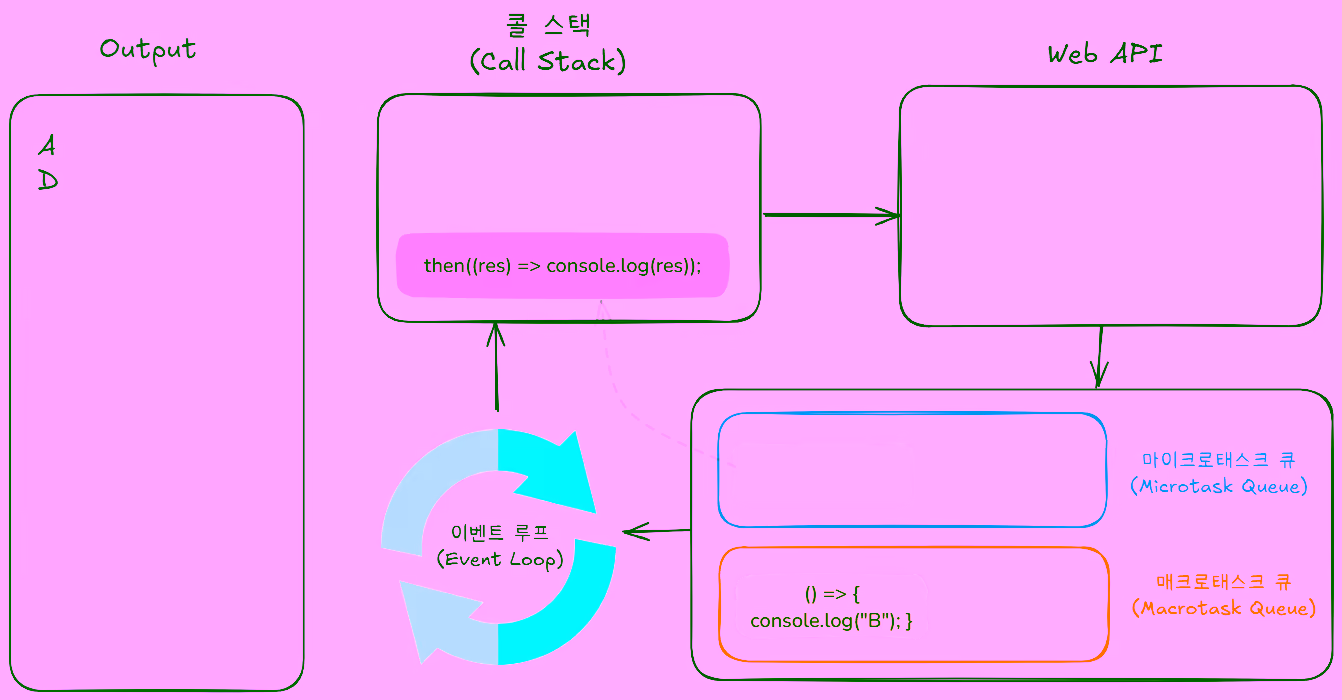 Promise코드가 콜 스택에 쌓인 후then의 콜백 함수가 마이크로태스크 큐로 이동합니다.