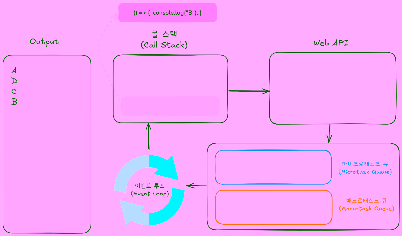 콜 스택에console.log("B");가 추가되어 실행된 후 콜 스택에서 제거됩니다.