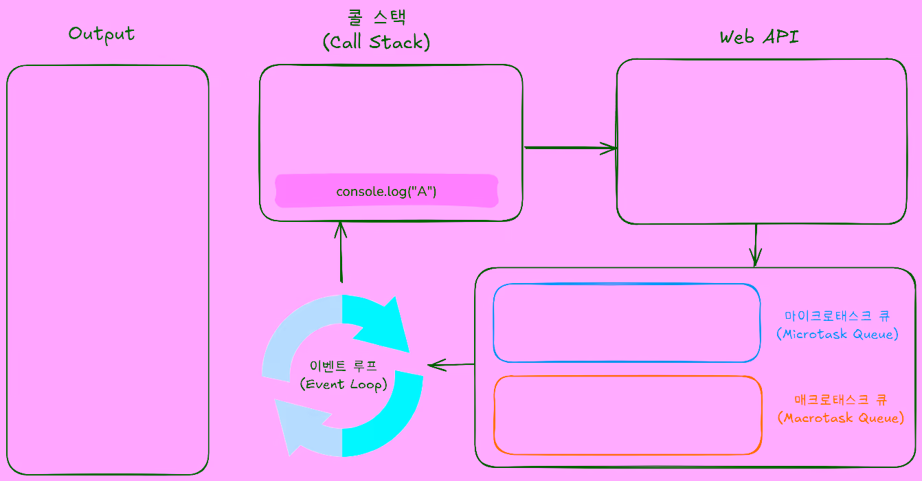 먼저 콜 스택에console.log("A");가 추가되어 실행된 후 콜 스택에서 제거됩니다.