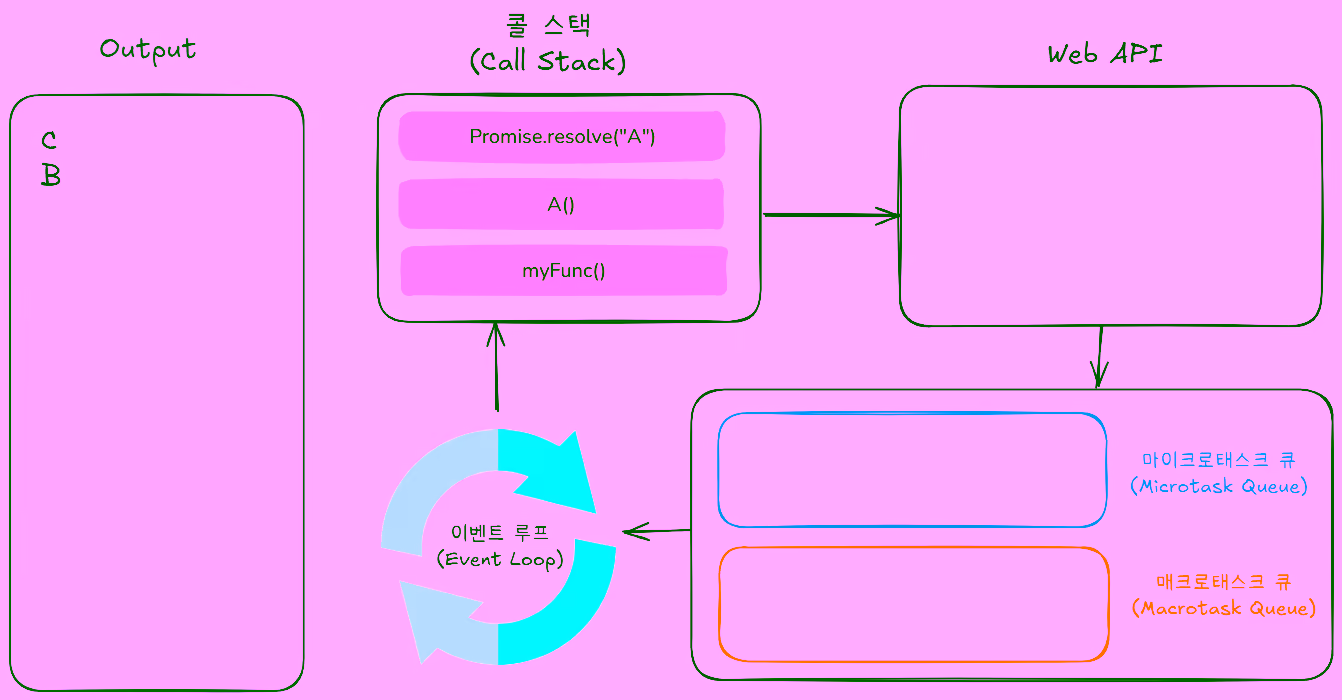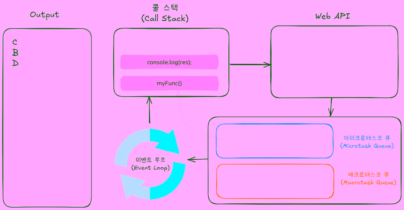 콜 스택이 비워진 후 먼저 마이크로태스크 큐의 Promise 콜백이 모두 실행된 다음,