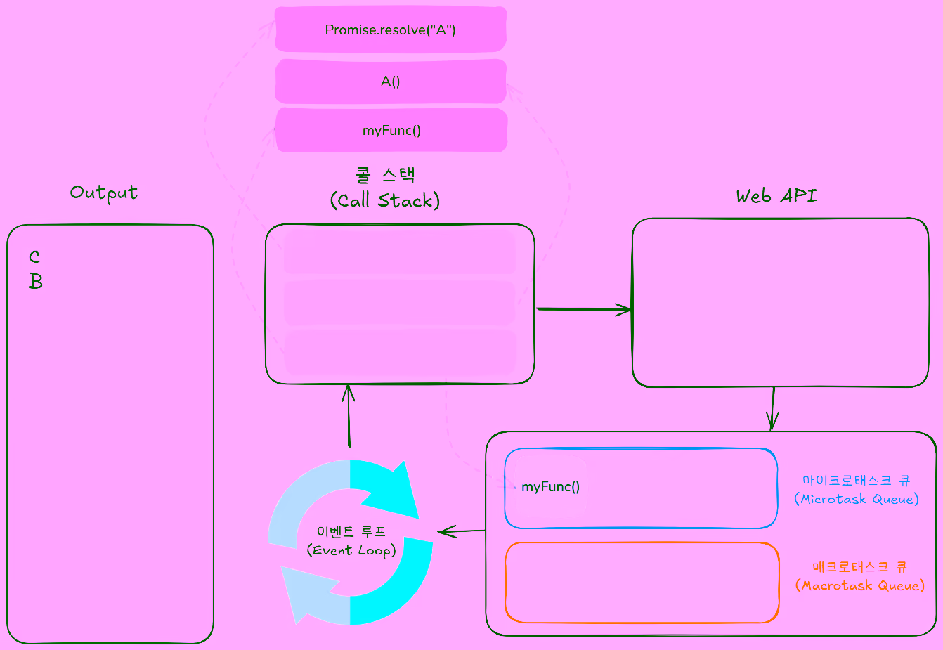 함수가 호출되면 콜 스택에 쌓이고, 실행이 완료되면 제거됩니다. 동기 코드는 즉시 실행되지만, 비동기 코드는 Web API로 이동합니다.Web API 처리