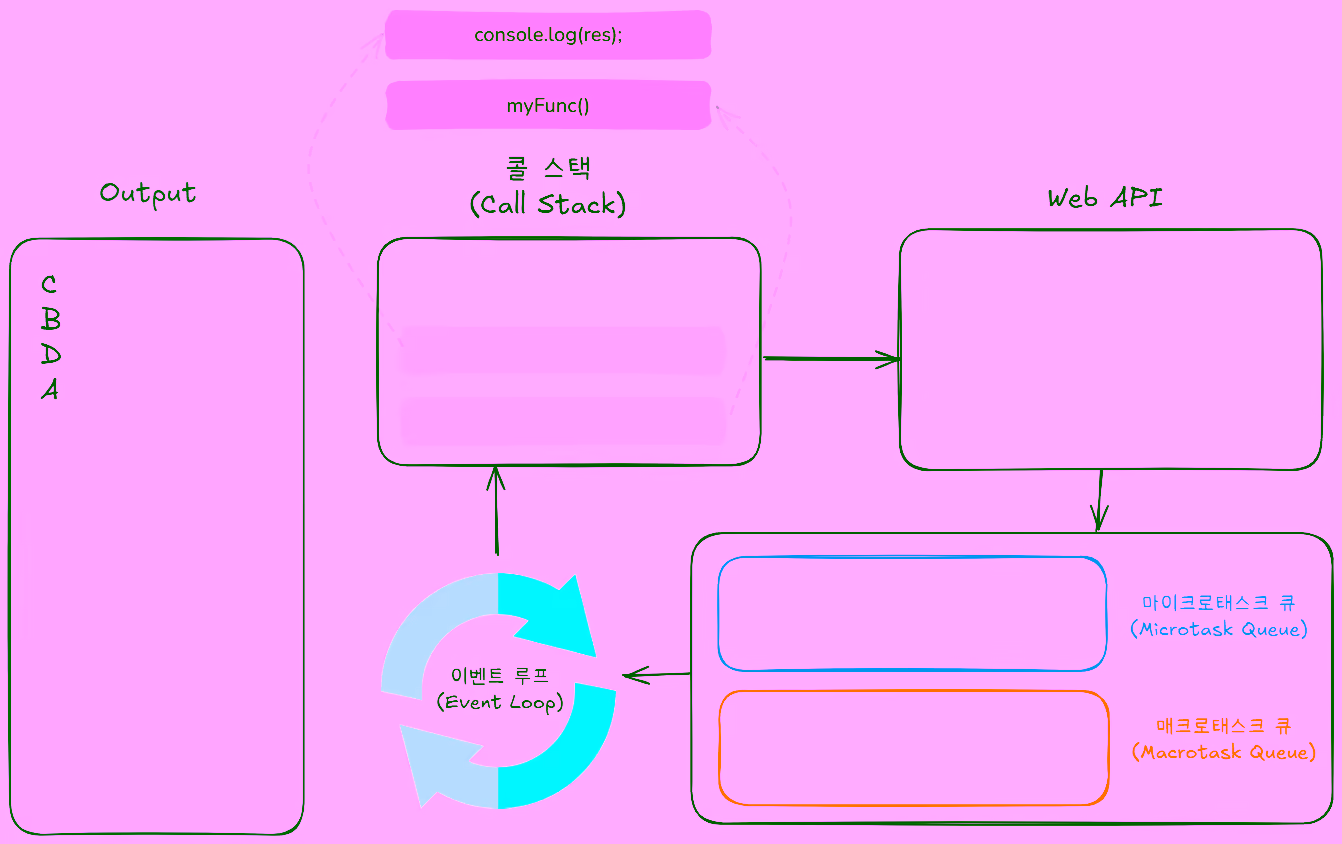이후 "D" 를 출력한 후 마이크로태스크 큐에서 await 이후의 코드가 실행되어 "A" 를 출력합니다. 실행 순서를 자세하게 설명하면 다음과 같습니다.