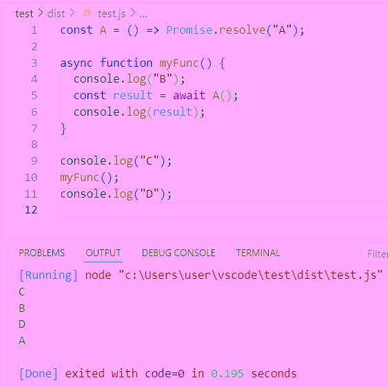해당 함수 내부의 A()의 Promise가 해결되기 전까지 myFunc 함수를 일시 정지합니다.
