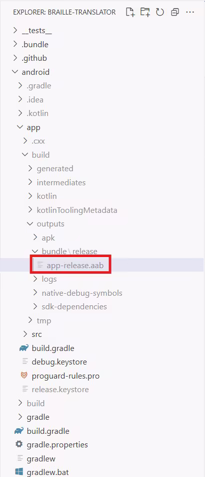 빌드 완료 후 다음 경로에서 빌드된 AAB를 확인할 수 있습니다.
