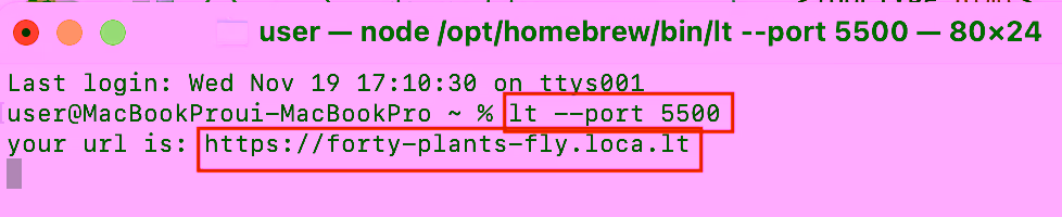 로컬 서버가 실행되었으면 다음 명령어를 입력하여 localtunnel을 실행합니다.