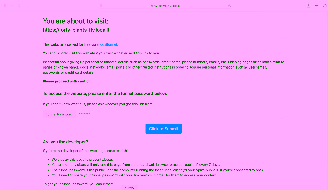 웹 페이지 하단에 표시된 링크(https://loca.lt/mytunnelpassword)에 접속하여