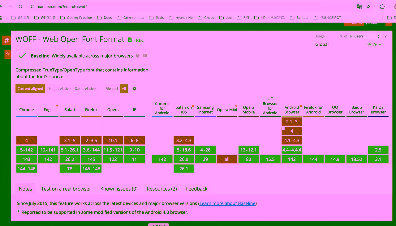 위의 사진을 보면 알 수 있듯이, WOFF2 포맷은 다른 폰트 포맷과 대비에 용량이 훨씬 작습니다. 따라서 WOFF2를 우선으로 적용하고 만약 브라우저가 WOFF2를 지원하지 않는 경우 WOFF를, WOFF도 지원하지 않으면 TTF 또는 OTF를 적용하도록 구현하는 것이 최선입니다.