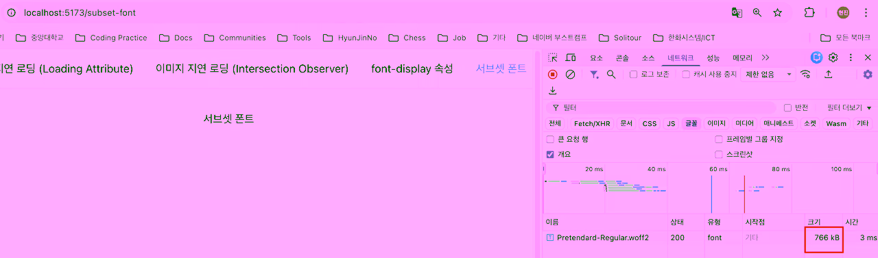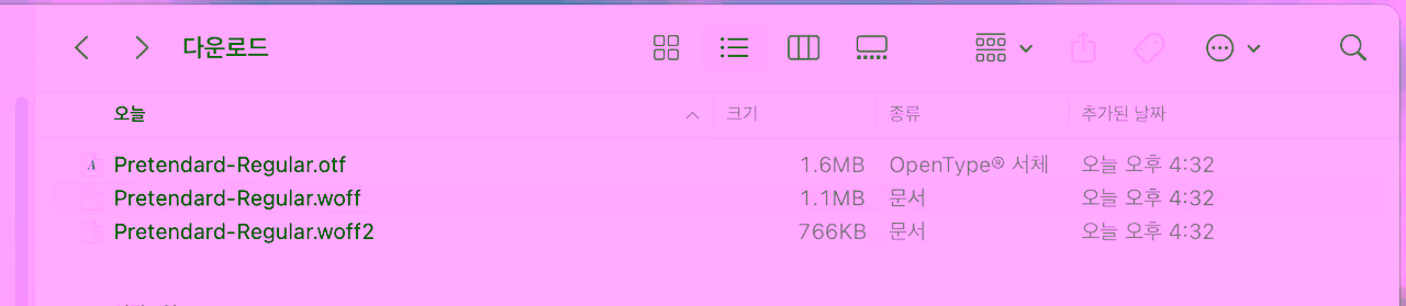 예를 들어 다음과 같이 파일 용량이 766 KB인 Pretendard-Regular.woff2 파일이 있는 경우,