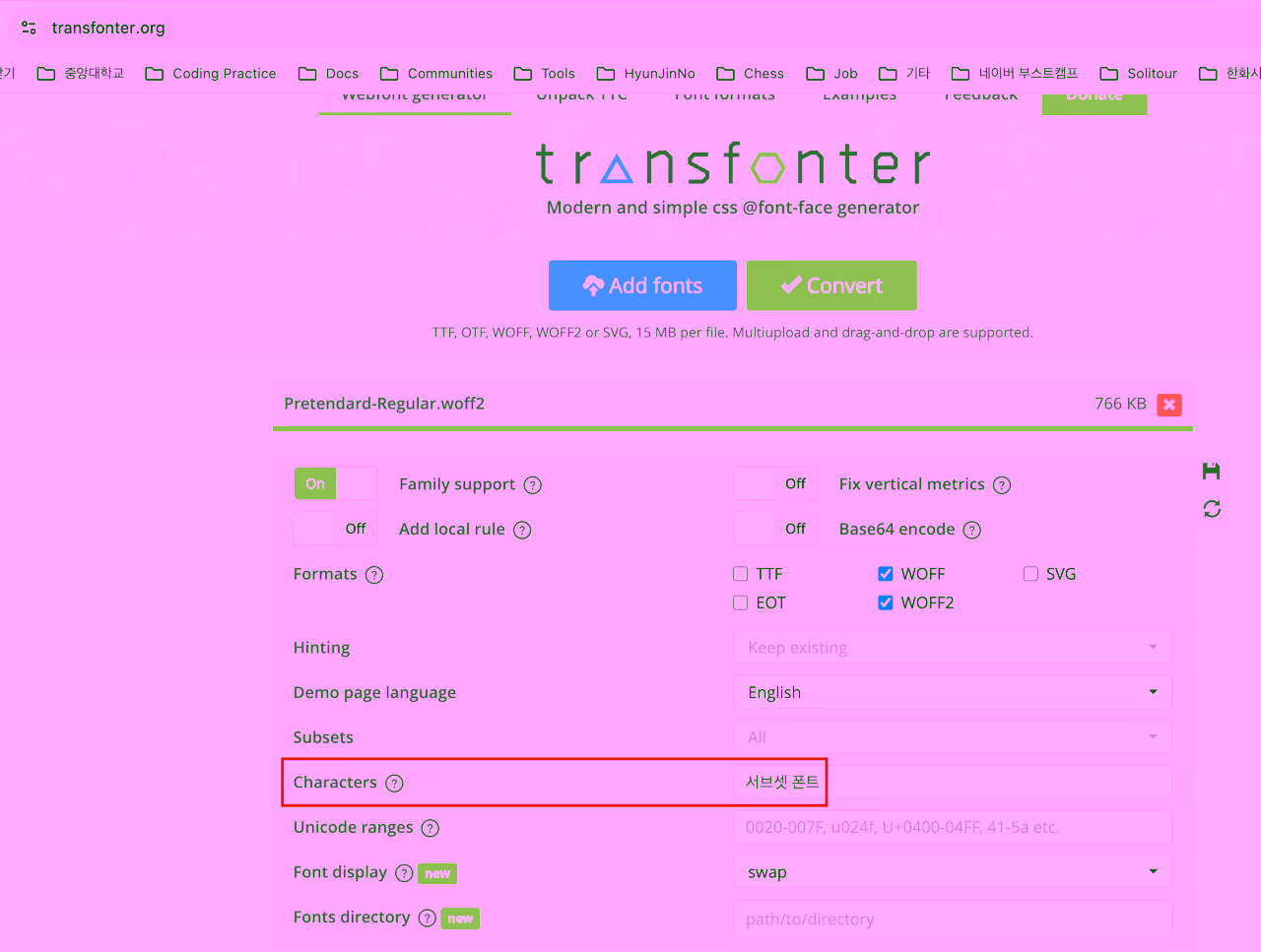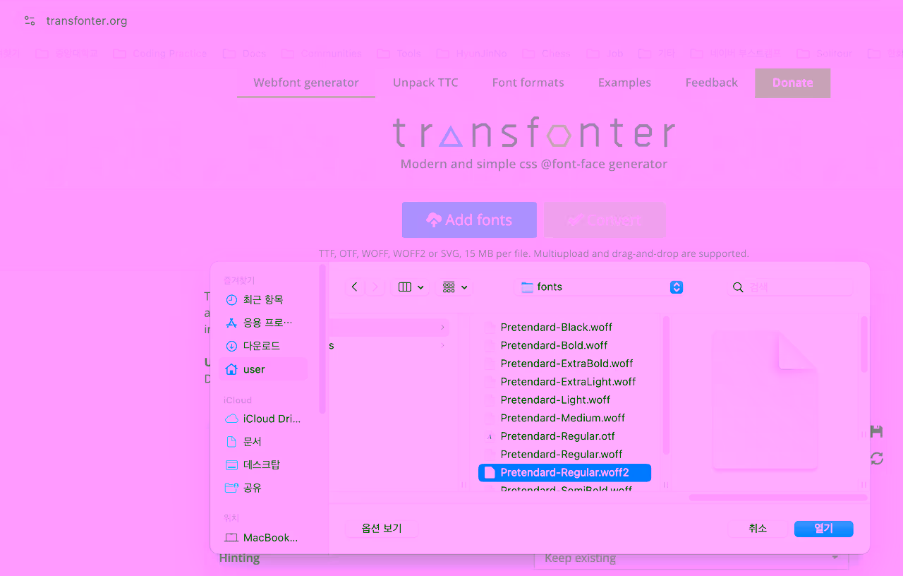 이 폰트 파일을 서브셋팅(Subsetting)하여 서브셋 폰트를 생성하면 파일 크기를 크게 줄일 수 있습니다. 서브셋 폰트를 만드는 방법은 여러 가지가 있지만, 이 글에서는 Transfonter 서비스를 이용하여 생성하겠습니다.